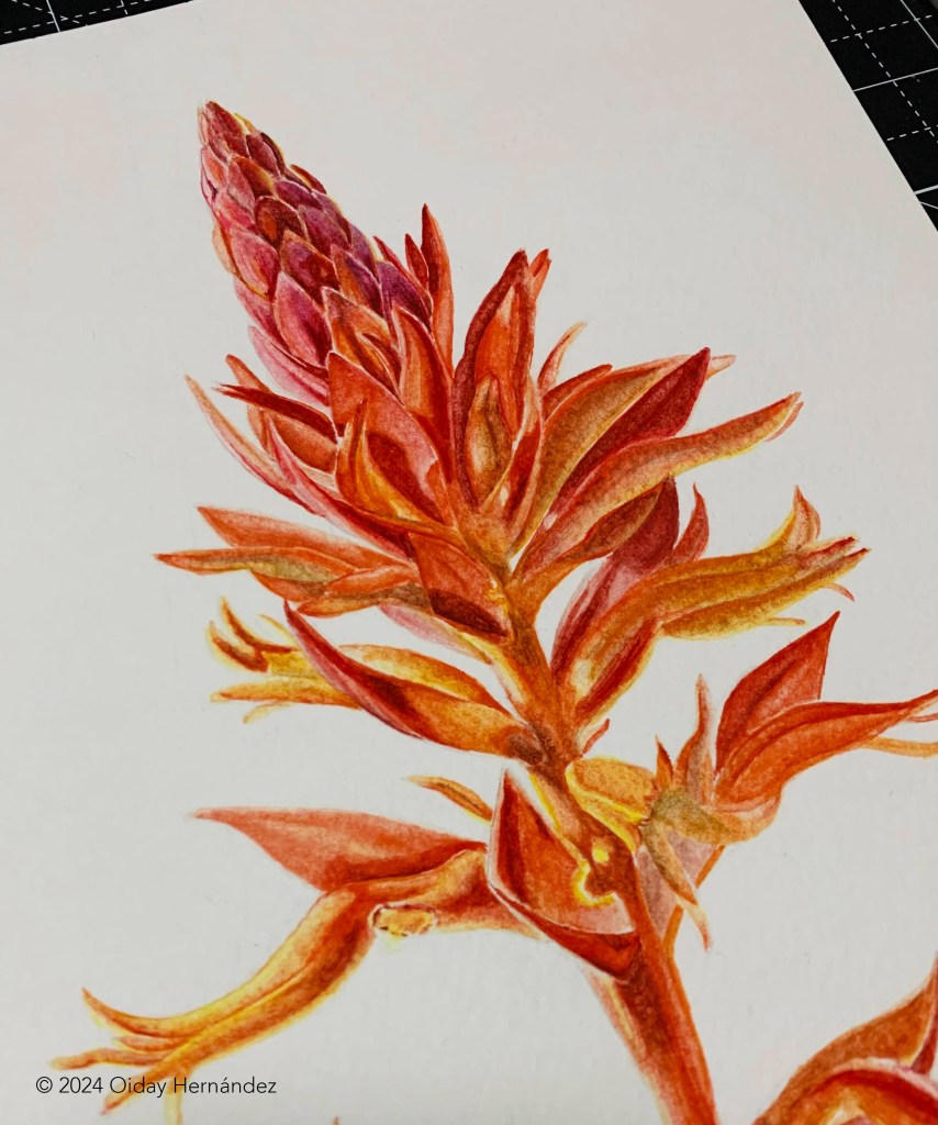 Como parte del mismo proceso de ingreso, la tercera y última etapa consistió en presentar una pieza inédita. Para ello, pinté una orquídea nativa de la Ciudad de México, una Cutzis (Dichromanthus cinnabarinus), utilizando acuarela sobre papel de algodón. A esta flor decidí darle luz, destacar sus colores vivos, no sólo por su belleza, sino por la relación esencial que tiene con los polinizadores. Fue mi forma de rendirle homenaje, de hacerla brillar en medio del papel, como lo hace en su hábitat al atraer vida (Figura 3). Con mucha felicidad puedo decir que las nativas me ayudaron a hacer realidad ese sueño de ingresar.