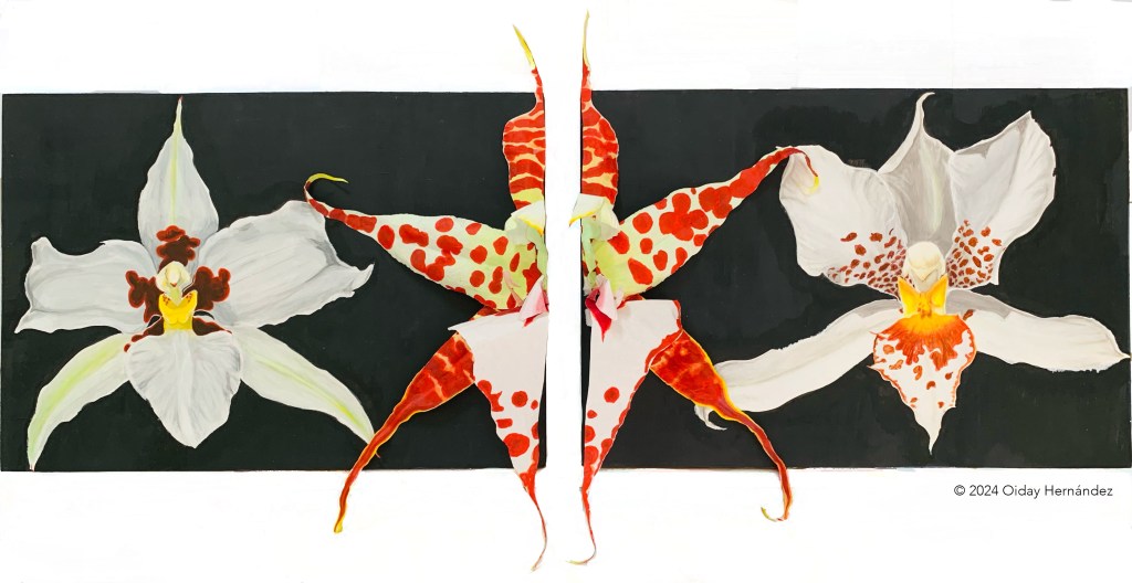 Figura 2. Díptico Autorretrato Rhynchostele. Acrílico sobre madera y papel de arroz tintado con acuarela. 27.7 x 40.5 x 5 c/u. 2024.