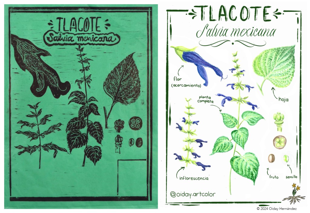 Elegí ilustrar la Salvia mexicana, conocida comúnmente como Tlacote. Es una planta que crece en zonas templadas y húmedas, reconocida por su intensa flor morado-azulada, que suele utilizarse con fines ornamentales. La pinté en acuarela sobre papel de algodón, y posteriormente digitalicé la imagen para añadirle etiquetas botánicas (flor, hoja y semilla), elementos que facilitan su identificación y comprensión. Como primer acercamiento al Tlacote, realicé un grabado en linóleo, que luego imprimí sobre papel de arroz. Fue un ejercicio más intuitivo, casi como un ensayo. Esa textura más cruda y directa me permitió conocer la planta desde otra perspectiva: no a través del color, sino mediante la forma, la línea y el contraste. (Figura 1)